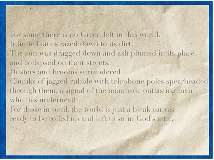 Hill: Man vs Nature is often something I contemplate in my writing. Our divisiveness when it comes to the world we come from our constant need to separate ourselves from our animalistic instincts by creating a separate reality to quell this anxiety. It is such an interesting concept to try to understand society and even myself, which is why I juxtaposed the destruction of our creations aided by Mother Nature and then Nature being destroyed by our creations, cars vs animal life.
