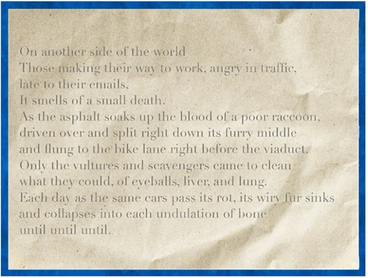 Hill: I originally planned to lengthen the poem but there was something final in being so straightforward with the language and having the images speak for themselves. I saw the dual stanzas as a reflection of each other, the first served as the view being reflected into the incident of a raccoon being ran over. I didn’t want it to have a doomsday effect or take such an event lightly, so I attempted to keep it less about my feelings and emotions and rather focused on what was/is true.